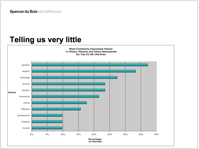 The values wrapped up in your brand can help you understand and communicate why your charity is special. And yet there is very little variation in values from charity to charity. Spencer du Bois created this chart, showing the most common values of the UK top charities – it powerfully illustrates the problem. Many of these values communicate the essence of charity rather than what’s special about the cause and the charity’s approach. This is at best useless, but at worst it’s very damaging. It creates a sea of well meaning but ultimately bland brands, and bland is not good for creating valuable emotional connections with people.